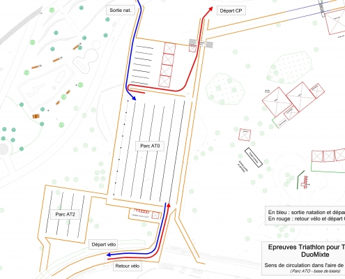 Dans un tout premier temps, l’athlète dépose ses affaires de course à pieds dans le parc à vélo situé sur le site d’arrivée (AT2, voir plan plus bas), à l’emplacement correspondant au numéro de dossard attribué par l’organisateur (parc ouvert de 14h à 15h30 le jour de l’épreuve). Il les retrouvera lorsqu’il aura fini son parcours vélo.